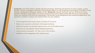 Kaspersky Lab Releases Kaspersky Anti-Virus 5.5 for ... Kaspersky Lab, a leading developer of secure content management solutions, has released Kaspersky Anti-Virus 5.5 for Microsoft Exchange Server 2000/2003. This latest software solution is part of... PDF KASPERSKY Anti-ViRuS foR WindoWS SERVERS EntERPRiSE Edition Kaspersky Anti-Virus for Windows Servers Enterprise Edition can be purchased as part of: Kaspersky Endpoint Security for Business - Select Kaspersky Endpoint Security for Business - Advanced Kaspersky Total Security for Business It can also be purchased as part of the Targeted Solution Kaspersky Security for File Server. A list of Kaspersky ...