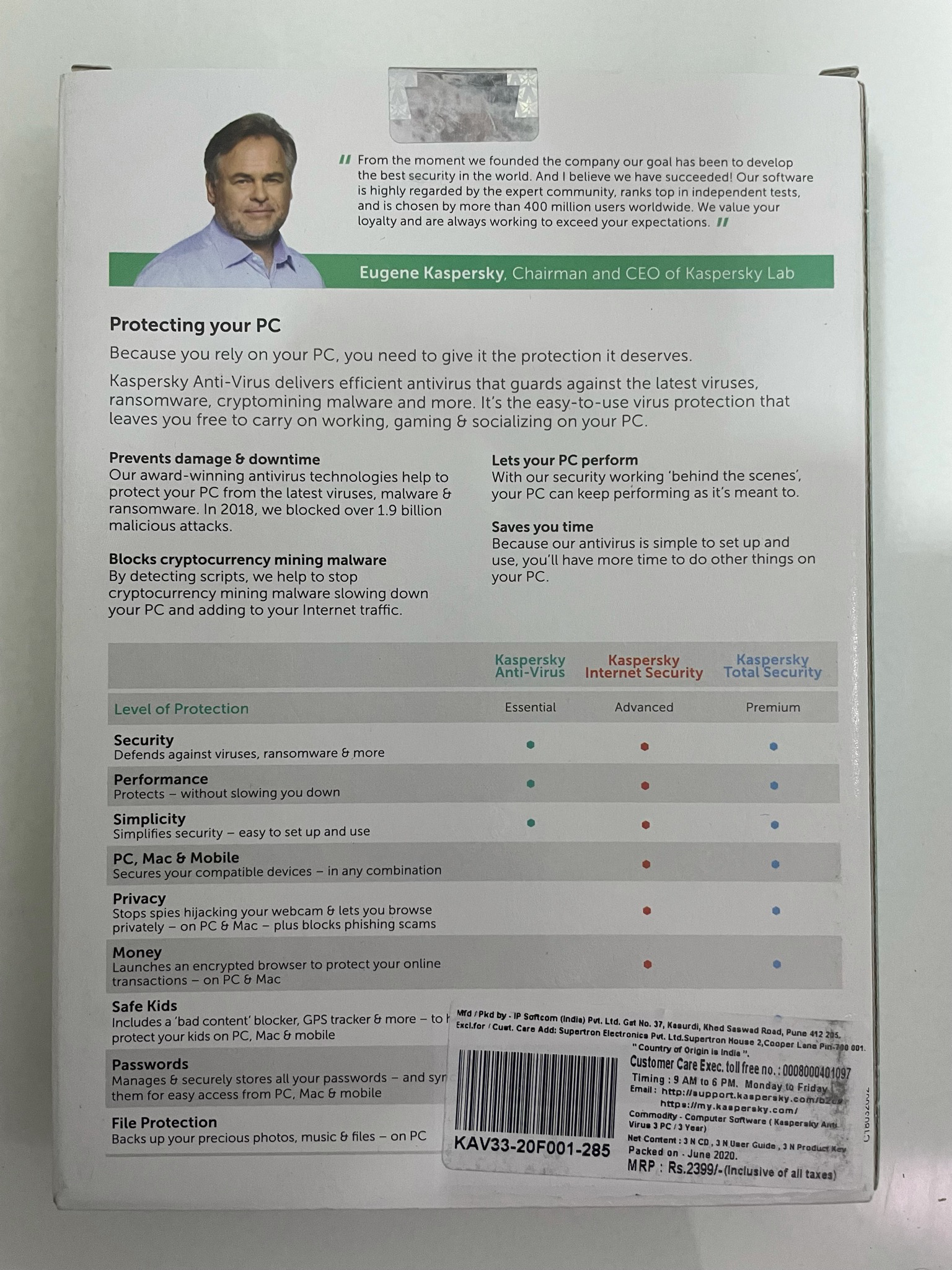 Kaspersky Antivirus 2016 ( 3 PC / 3 Year ) CD - Buy... - Snapdeal The Kaspersky Antivirus is valid for a period of 3 years after which one must renew the license. This software is permissible for 3 users only and provides Your PC must have 1 GB RAM. For best results however, it is advisable to have a RAM higher than that. It is also important to have a free space of... Kaspersky Antivirus 1 Pc 3 Year 2021 | Online Key Kaspersky Antivirus 1 Pc 3 Year. Features :- Think of all the precious things on your PC. We can help you protect them against viruses, spyware more. Our award-winning security makes it easy to defeat digital dangers; without slowing you down. - Protection against Wanna Cry Ransomware... Kaspersky Antivirus 2020 - 3 PC, 3 Year - (Activation Code On...) Kaspersky Anti-Virus is the smarter way to protect everything on your PC… to help keep you safe from viruses, spyware & Trojans - and help stop ransomware locking up all your files. Bitdefender Internet Security 2020 - 3 PC, 3 Year (Activation Code On Email). Please note Kaspersky 3 Device Antivirus & Security Software for sale | eBay Kaspersky antivirus anti virus 2022 - 3 pc / user 1 year | UK eu download. SPONSORED. Kaspersky Internet Security 2021 3 Devices 1 Year PC/Mac Activation Post EU UK. £20.75.